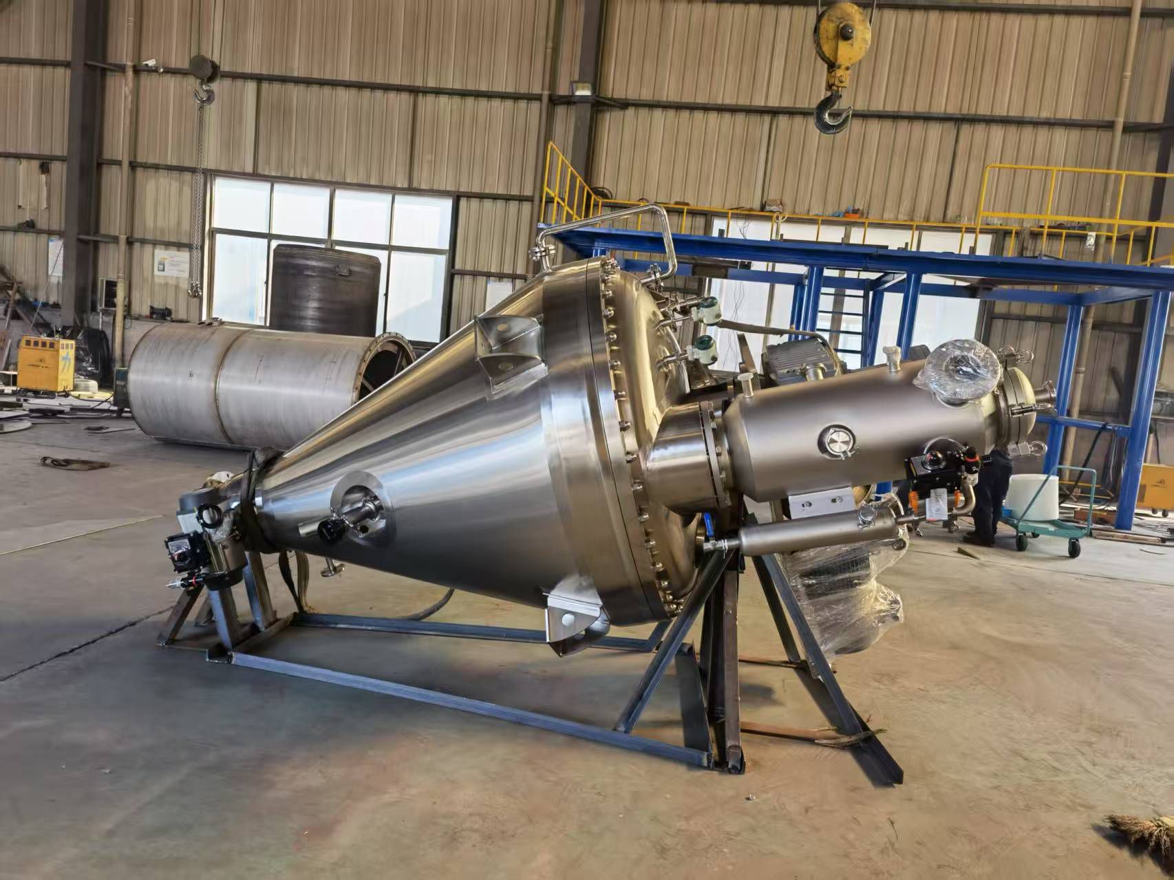 特性:垂直錐形罐體,帶有加熱/冷卻系統(tǒng)的半盤管,加熱或冷卻軸,加熱或冷卻攪拌/混合葉片,帶有過濾系統(tǒng)和冷凝系統(tǒng)的圓頂,可以連接到真空泵