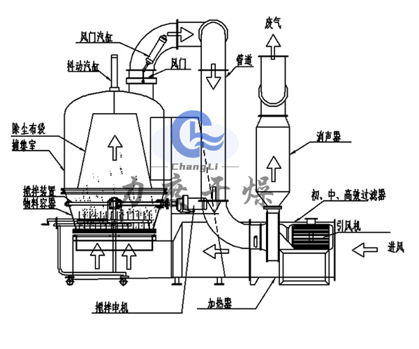 待干燥的物料(顆?;蚣?xì)粉)投入干燥器料斗,空氣經(jīng)初效過濾器除塵后,由加熱器升溫至干燥所需要的溫度,然后進(jìn)入主塔,當(dāng)其穿過料斗底部的席型分布板,使料斗內(nèi)物料流化同時(shí)除去水份而干燥,水份揮發(fā)后隨排風(fēng)經(jīng)布袋過濾器過濾后由風(fēng)機(jī)排出,干燥過程中隨風(fēng)上升的細(xì)粉則由布袋捕集,并通過清灰裝置返回流化床。