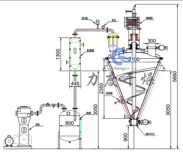 3.干燥效率高:有效傳熱面積大,是容器內(nèi)面積1.4倍;物料在器內(nèi)呈螺旋提升,再沿主軸呈渦流下降,在分散運(yùn)動(dòng)中均勻有效受熱;機(jī)頭高真空與機(jī)底同溫高速氣流同向結(jié)合,高效帶走物料的溶劑;雙通道真空管口,防止真空堵塞,降低阻力,提高抽氣速率。