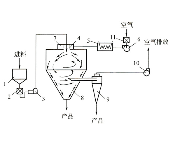 圖解:1一料罐2—過濾器3—泵4一霧化器5—空氣加熱器6—鼓風(fēng)機(jī)7—熱風(fēng)分配器8—干燥塔9一旋風(fēng)分離器10—引風(fēng)機(jī)11一過濾器