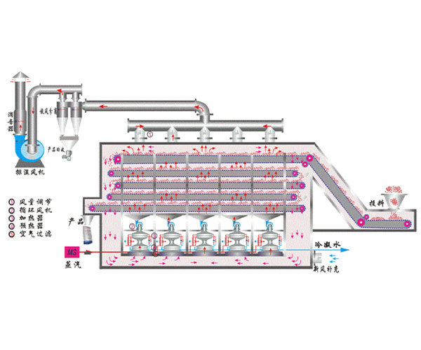 包括循環(huán)風(fēng)機、氣流加熱裝置、均風(fēng)箱、回風(fēng)箱等部件。熱風(fēng)在干燥倉內(nèi)多次循環(huán)穿透物料層,使被干燥的物料多次吸收熱風(fēng)的熱量,提高能源利用率,節(jié)約能源。